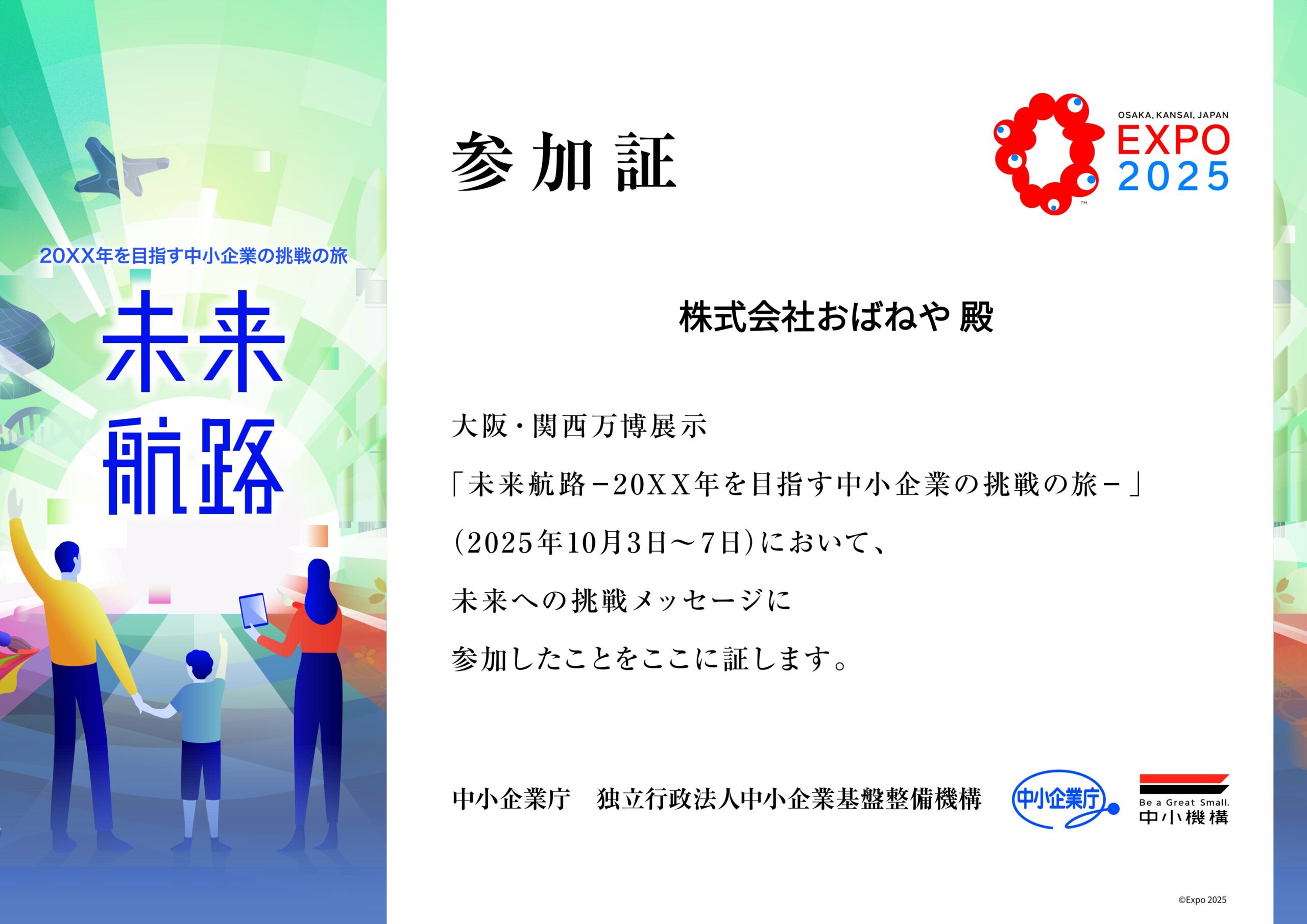 この度、独立行政法人中小企業基盤整備機構が大阪・関西万博にて、2025年10月3日(金)~10月7日(火)の5日間開催した体験型展示「未来航路 in 大阪・関西万博」に、弊社の取り組みが「未来への挑戦メッセージ」として選出され、展示いただきました。